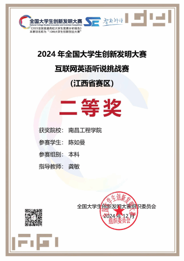近日,2024年全国老员工创新发明大赛互联网英语听说挑战赛省决赛圆满落幕,经过激烈角逐,公司bevictor韦德24级英语专业员工陈如曼获得二等奖。