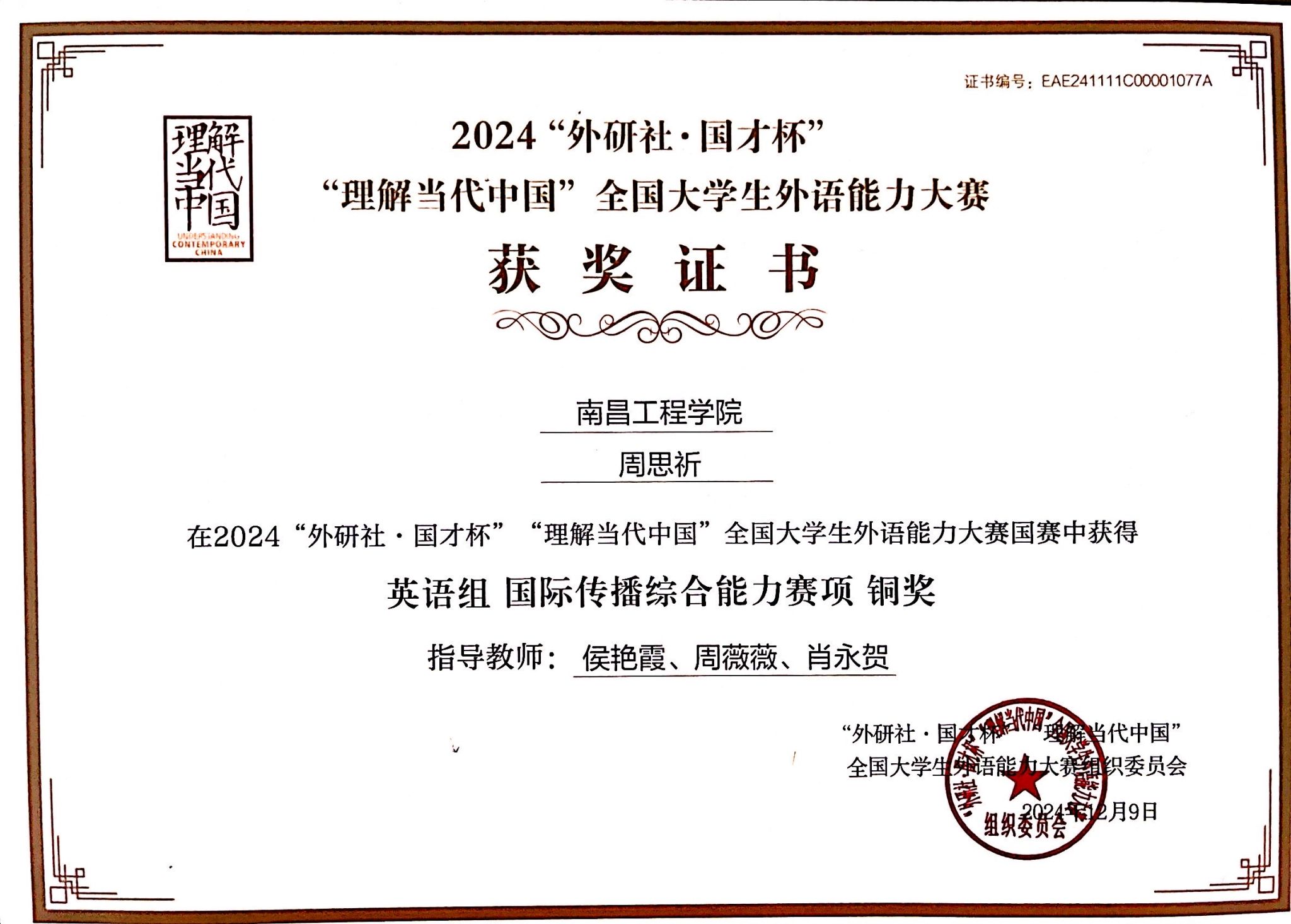 公司学子在2024“外研社•国才杯”“理解当代中国”全国老员工外语能力大赛英语组国际传播综合能力赛项喜获佳绩