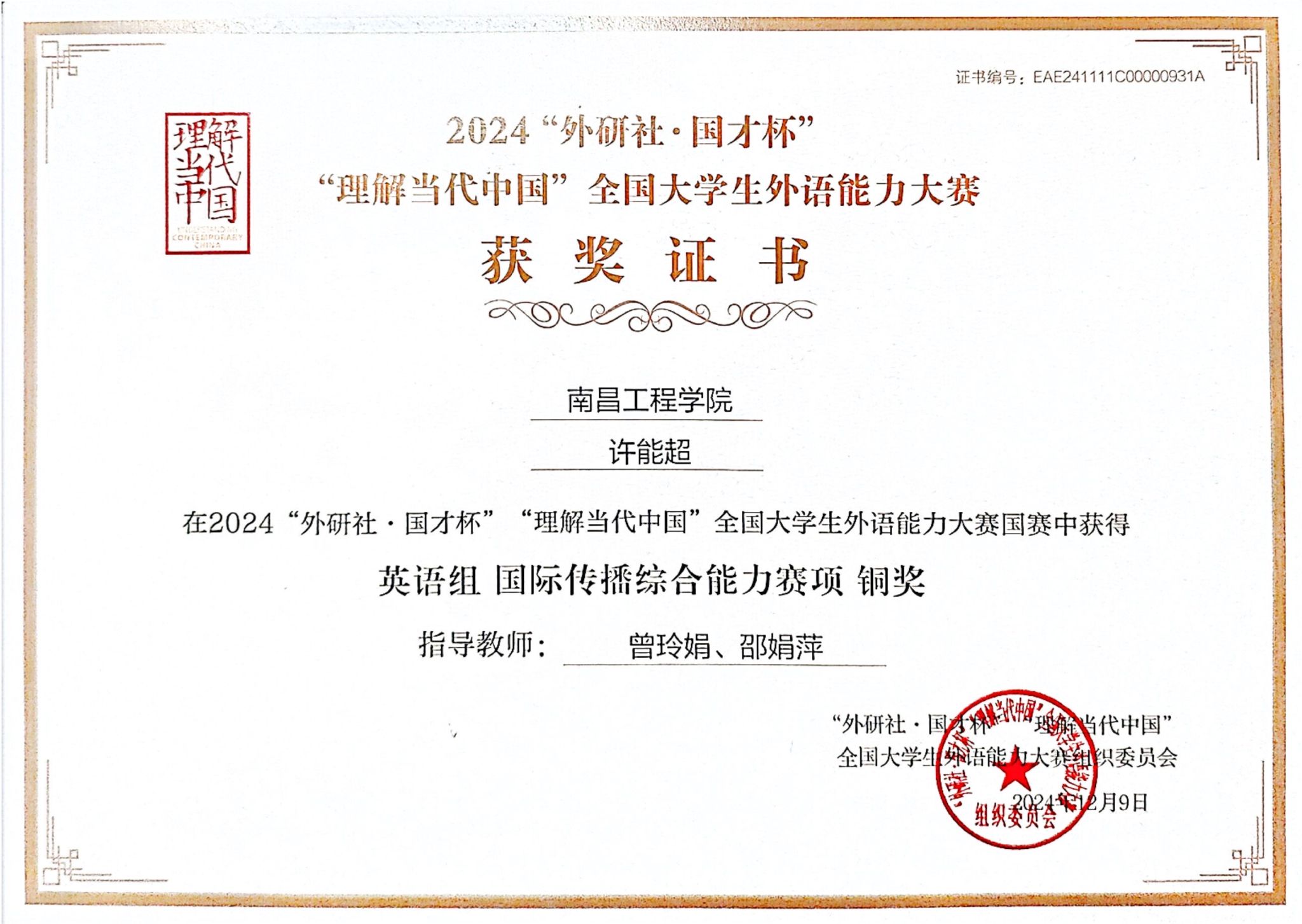 近日,2024“外研社·国才杯”“理解当代中国”全国老员工外语能力大赛系列赛事落下帷幕,公司2022级英语专业员工许能超、周思祈获得英语组国际传播综合能力赛项全国总决赛铜奖。