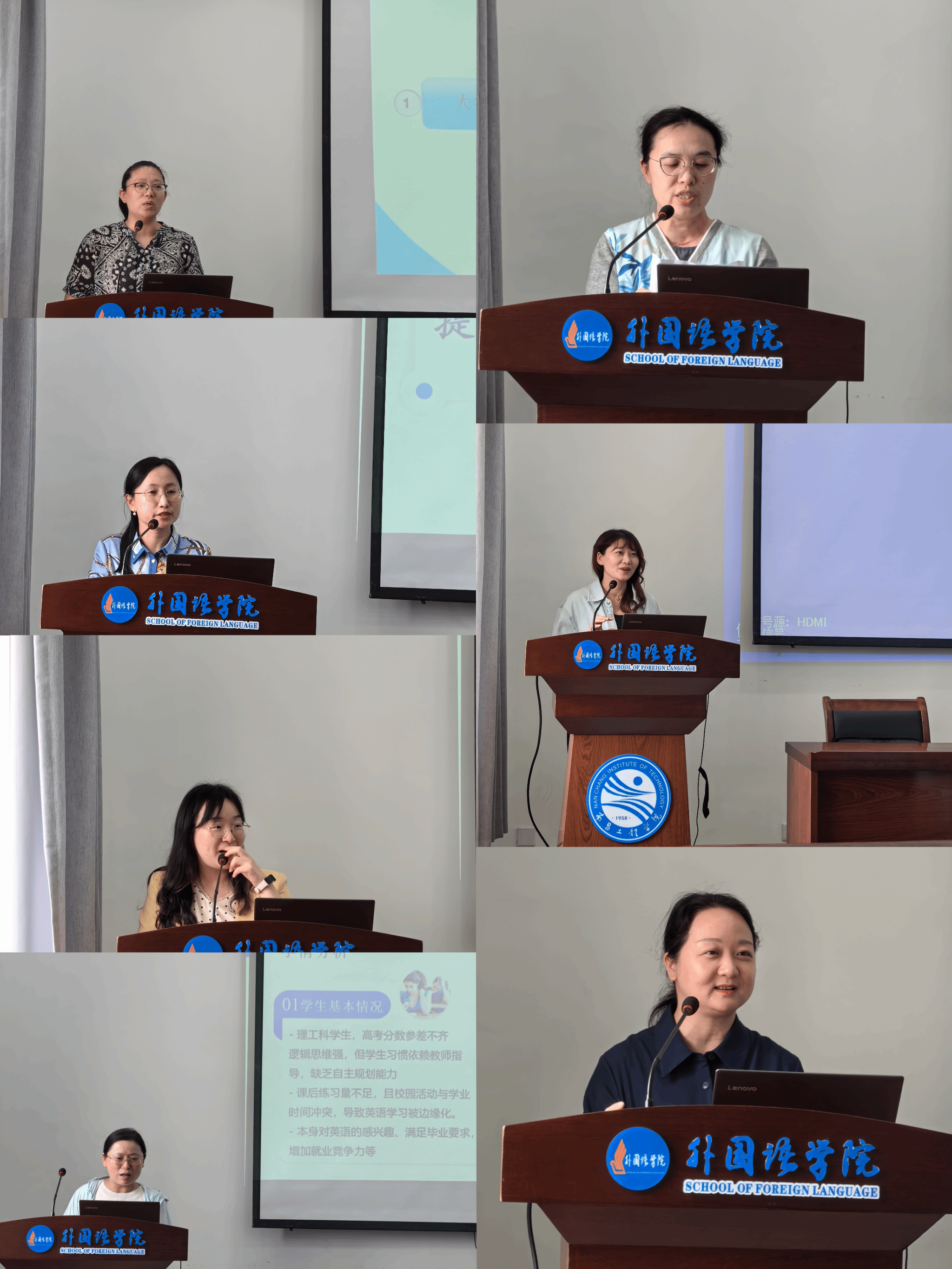 会议聚焦大学英语教学改革核心议题,侯艳霞、郑赛赛、邹艳丽、姜艳、李娟、陈蕾和邓荷共7位教师代表结合教学实践,分享了课程思政融入课堂的创新案例、四六级通过率提升经验,以及智慧教学平台、AI辅助教学等数字化工具的应用成果。与会教师围绕议题展开研讨,气氛热烈。