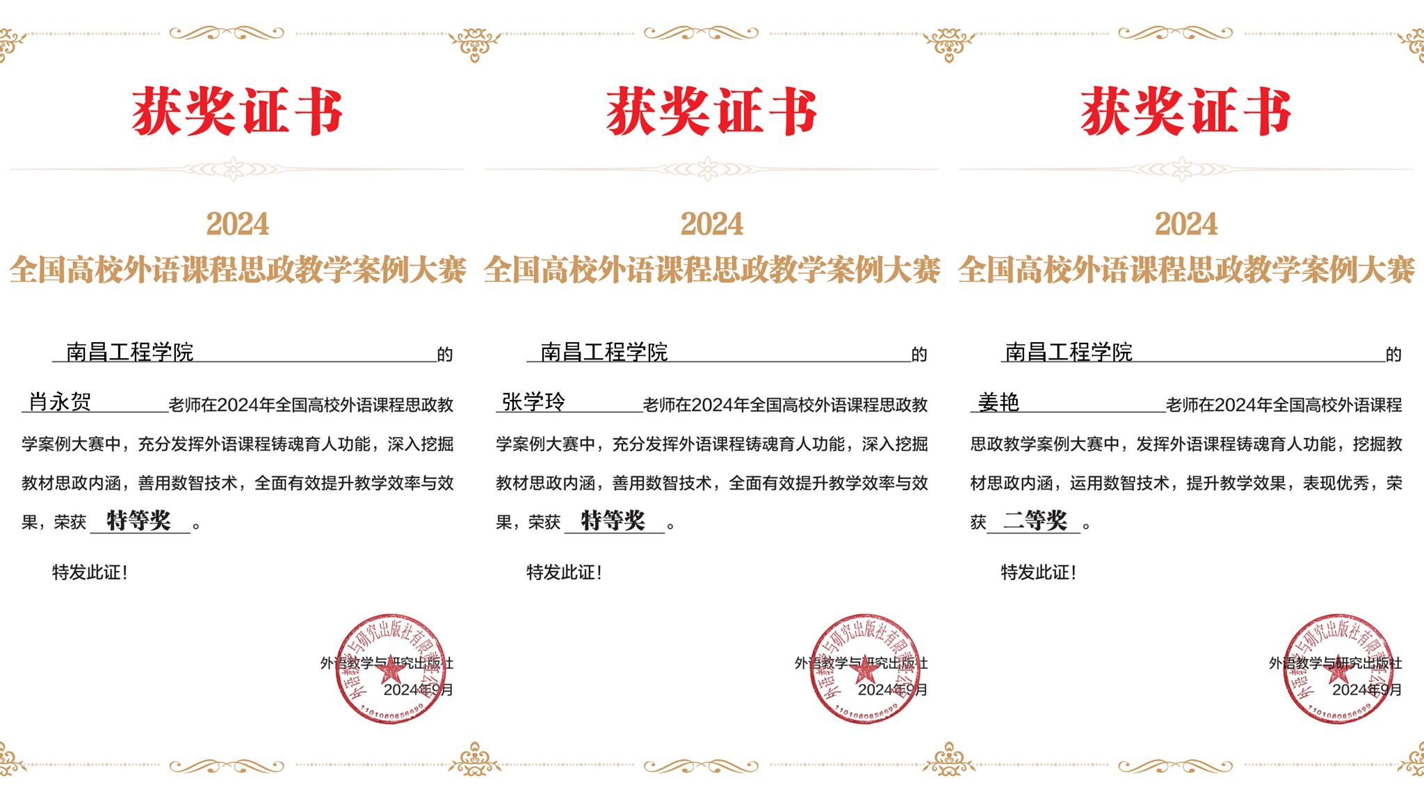 近日,2024年全国高校外语课程思政教学案例大赛圆满落幕,公司教师在该项大赛中获得佳绩,张学玲、肖永贺荣获特等奖,姜艳荣获二等奖。