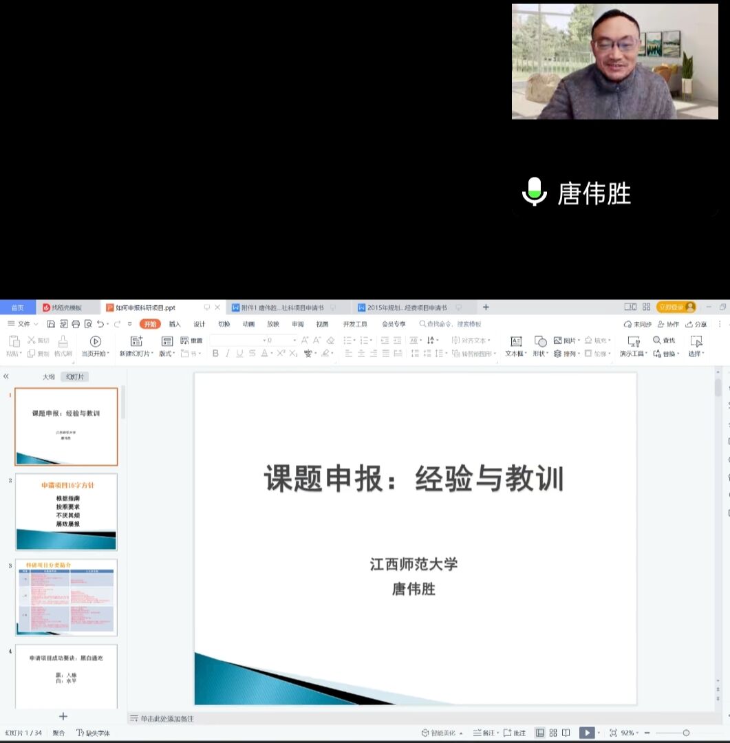 唐伟胜教授首先结合自身申报国家社科基金项目的成功经验与失败教训,总结精炼社科基金项目申报“16字方针”。然后从“正确认识社科基金项目的申报”“社科基金项目申报选题原则”“社科基金项目申请书、活页撰写”三个方面,系统地阐述了国家社科基金项目申报的重点与难点。