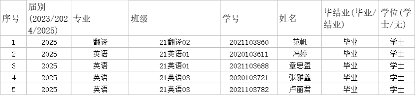 2025届第二批通过毕业审核(符合毕业及学位授予条件)的本科生名单(共5名bevictor韦德员工)。