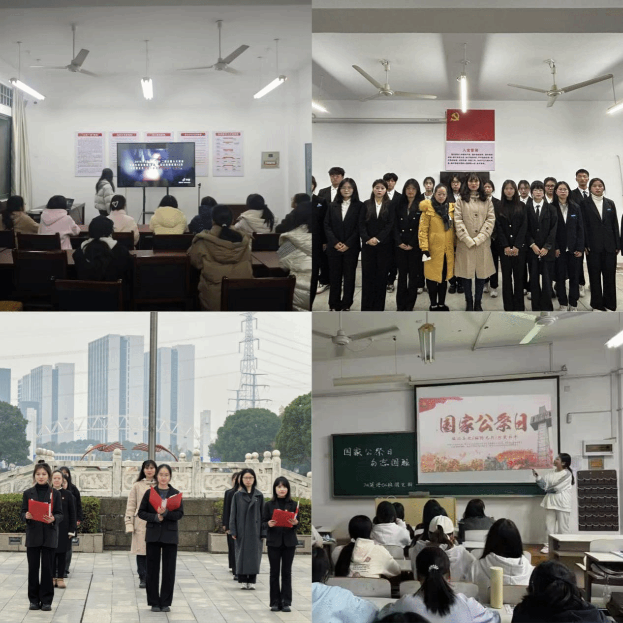 主题活动以多样的方式开展,班级采取了播放相关视频、默哀等方式,开展以勿忘国耻、圆梦中华为主题的团日活动;员工党支部开展了员工采访以及国旗下的演讲主题党日活动;公司面向在校生举办“勿忘国难日,励志强国心”12·13国家公祭日主题演讲比赛,参赛选手用真挚的情感、生动的语言,讲述了一个个感人至深的爱国故事。