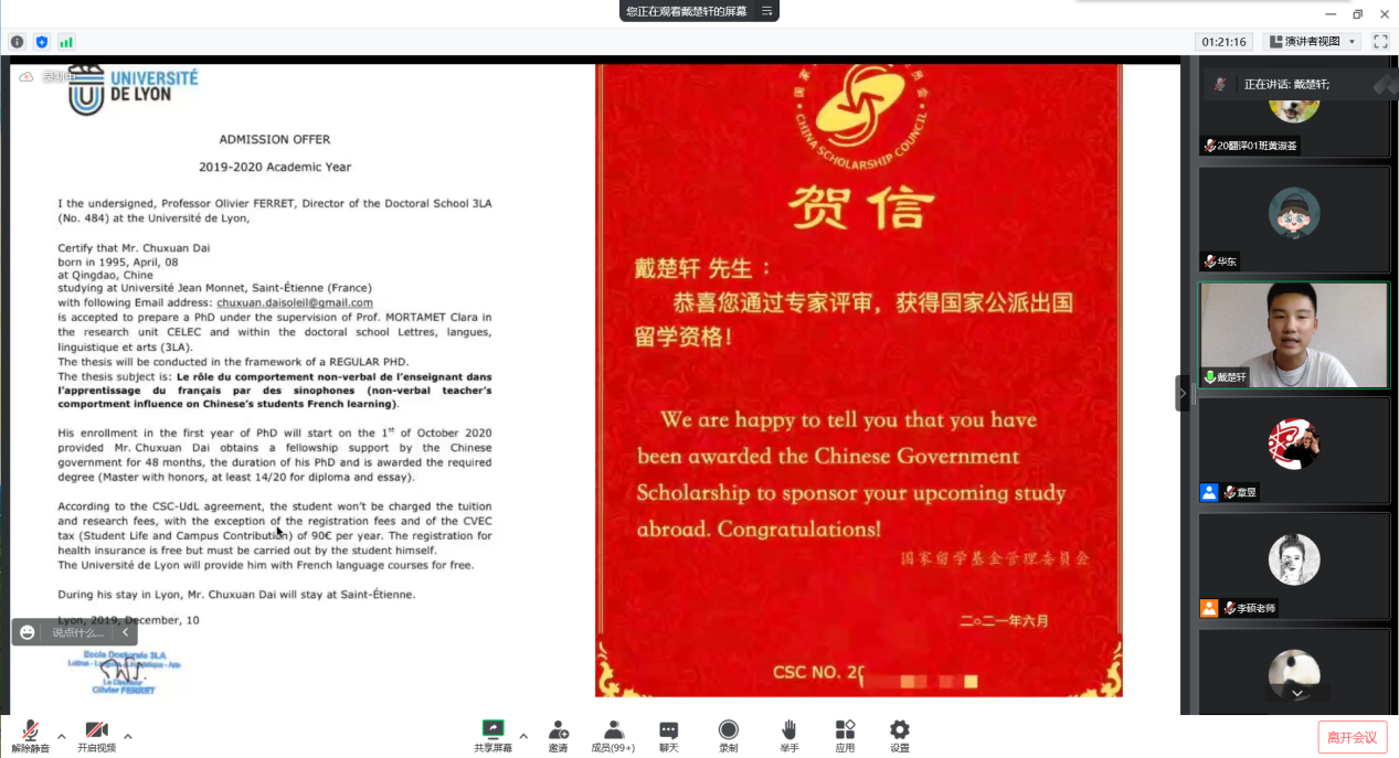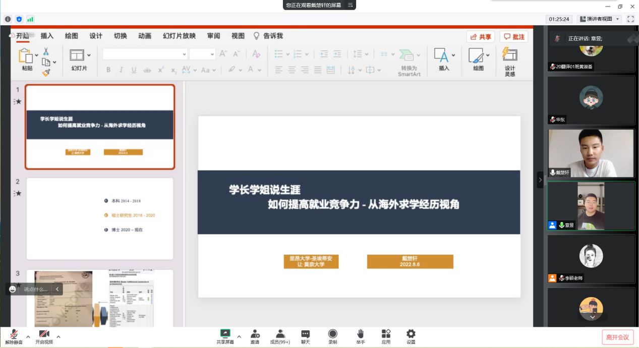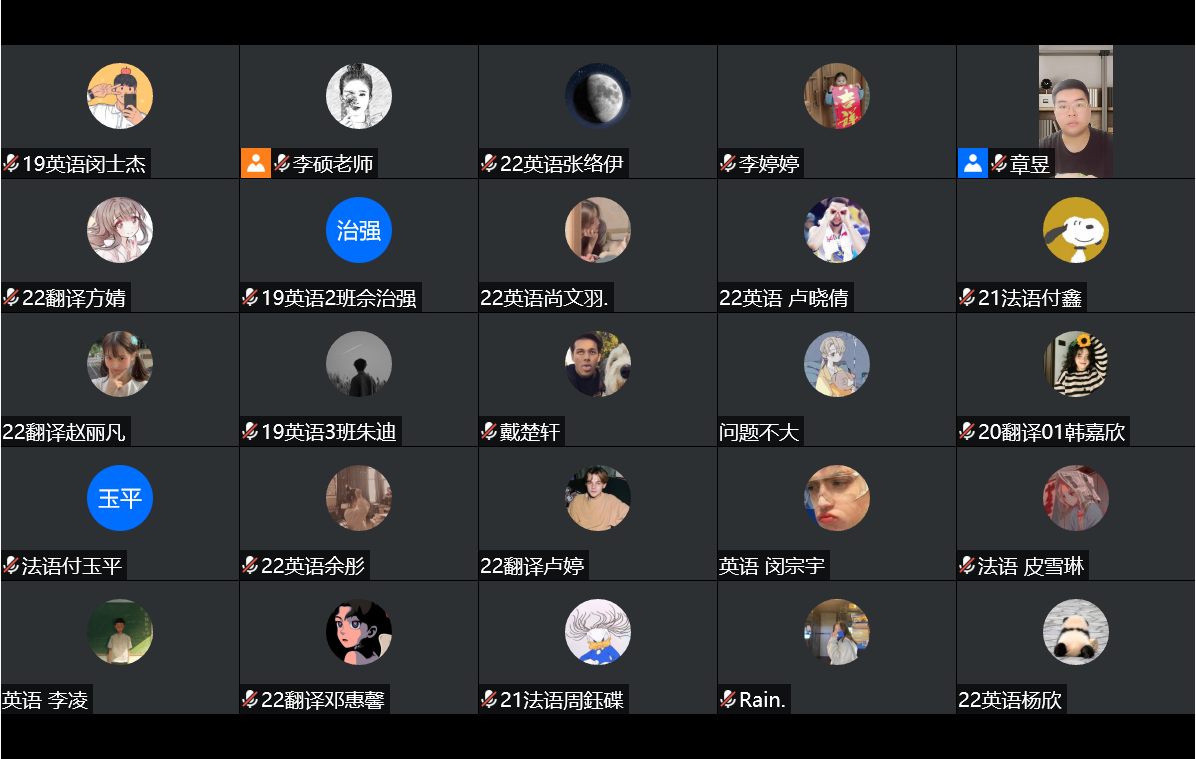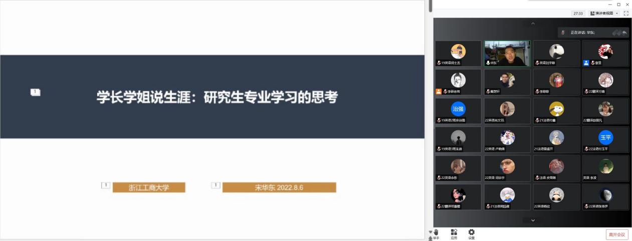 首先,正在浙江工商大学攻读翻译硕士学位的宋华东根据自身情况就考研择校、专业选择、职业规划向同学们分享经验,并向同学们提供了英语专四、专八复习建议。正在法国圣埃蒂安·让莫奈大学攻读博士学位的戴楚轩从本科、硕士、博士三个学习阶段出发,向同学们分享在海外求学过程中如何提高自身就业竞争力的经验,并鼓励同学们积极参与社会实践,以此提高自身的专业知识和综合素养。