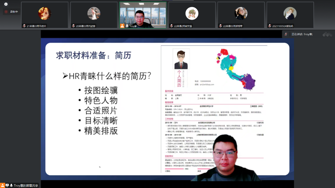 此次活动邀请了bevictor韦德辅导员章昱老师对同学们进行培训。章昱老师从简历的排版、格式、要求等多个方面对同学们进行培训,让同学们对简历大赛有了初步的认识和了解。他还指出,简历制作是一个长期的工作,需要我们不断地丰富自身学识及实践经历,提高简历含金量。
