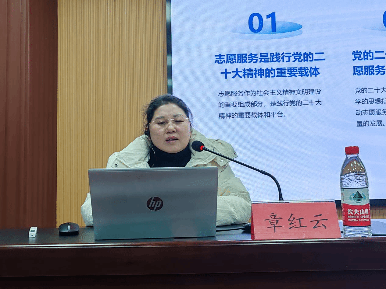 讲座中,章红云首先讲述党的二十大精神核心内容及重要意义,通过志愿服务在新时代焕光发彩的实践案例生动地描述了志愿者服务的过程。在结束时,章红云呼吁更多的同学加入志愿服务的队伍中去,为我们的社会贡献一份力量。