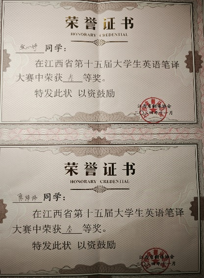 公司研究生在江西省第十五届老员工英语笔译大赛中喜获佳绩